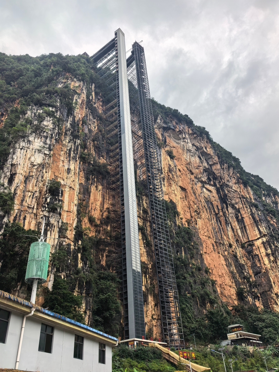 景区内268米高的“平步青云梯”和建设中的第二部垂直电梯(9月19日摄)。