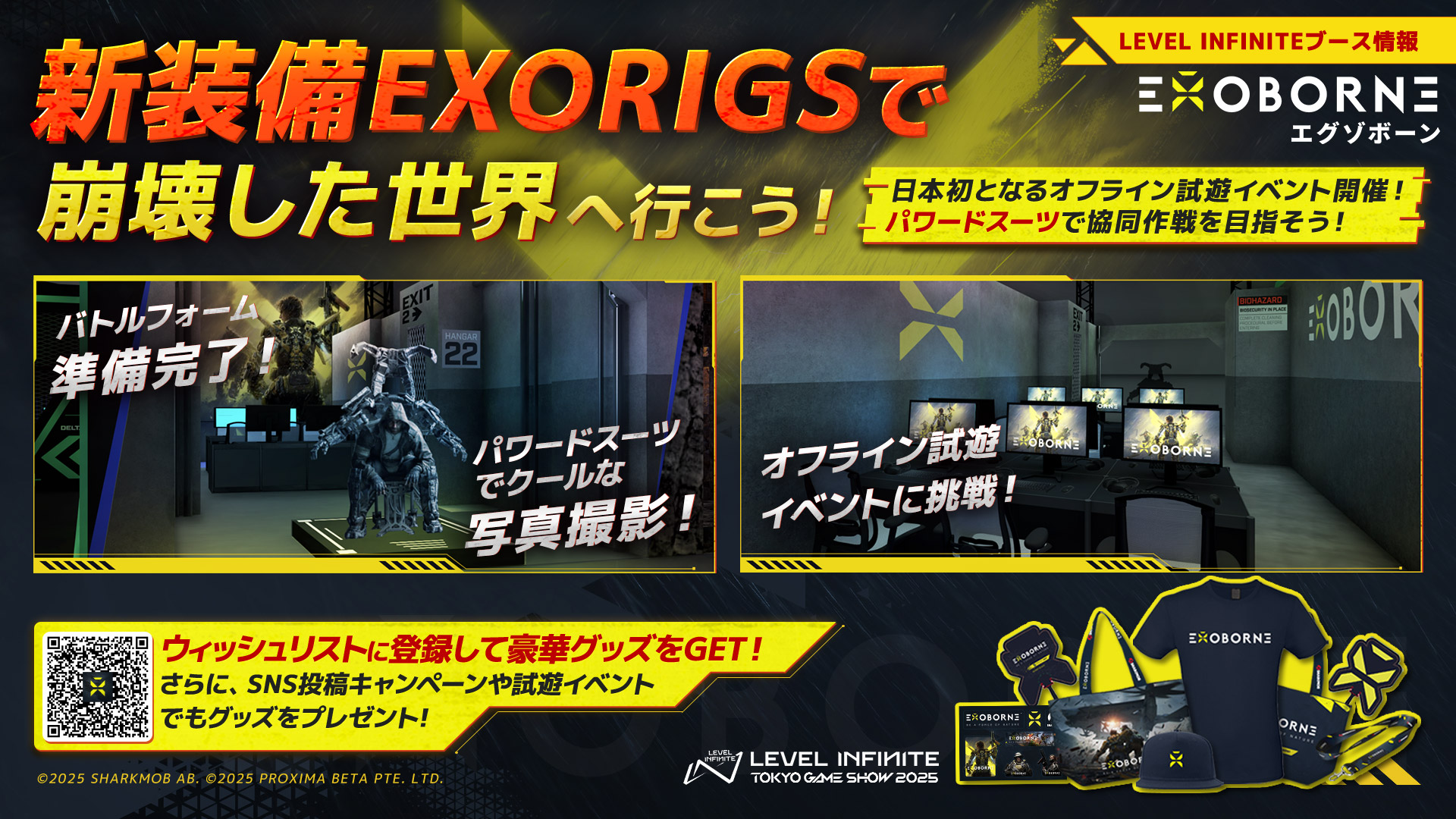 开放世界战术撤离射击游戏《EXOBORNE》展区将带来日本首次线下试玩!三人组队,共同探索近未来世界,对抗自然的极端力量。另外Exo-Rigs的装置也落地现场,玩家可以在现场拍照打卡,体验外骨骼装甲的魅力。